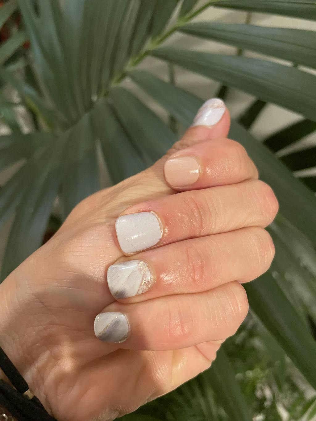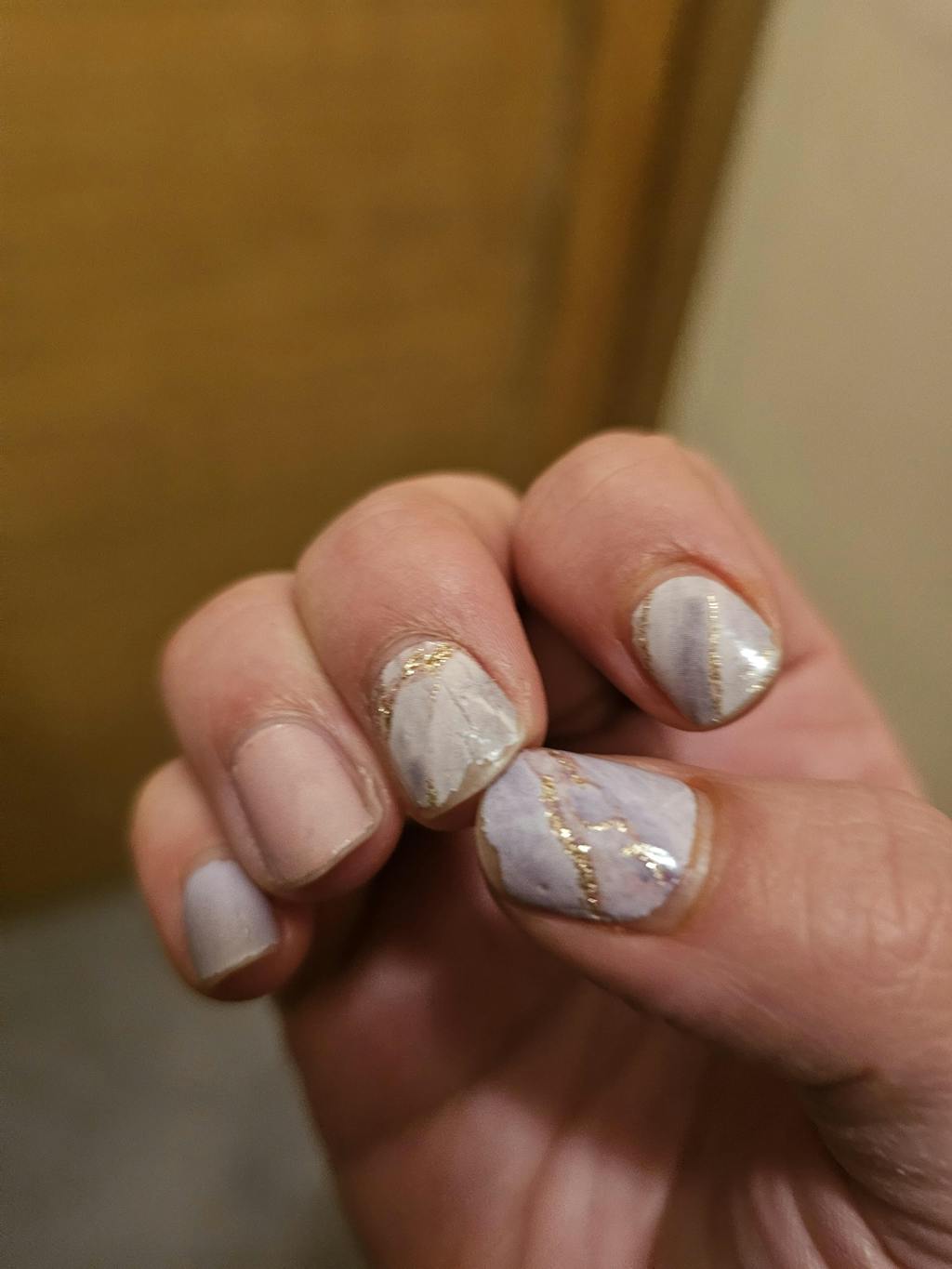 This design combines the purity of delicately veined light blue marble with fine, shimmering gold lines for a manicure that is both modern and timeless. The nude and pastel blue shades evoke a sense of calm and sophistication, while the gold accents subtly catch the light.