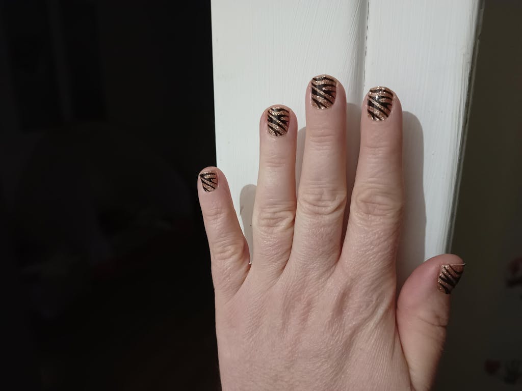 This design reinterprets the zebra pattern in an elegant and sophisticated version. Graphic black lines stand out against a warm gold base, creating a strong yet perfectly controlled contrast.