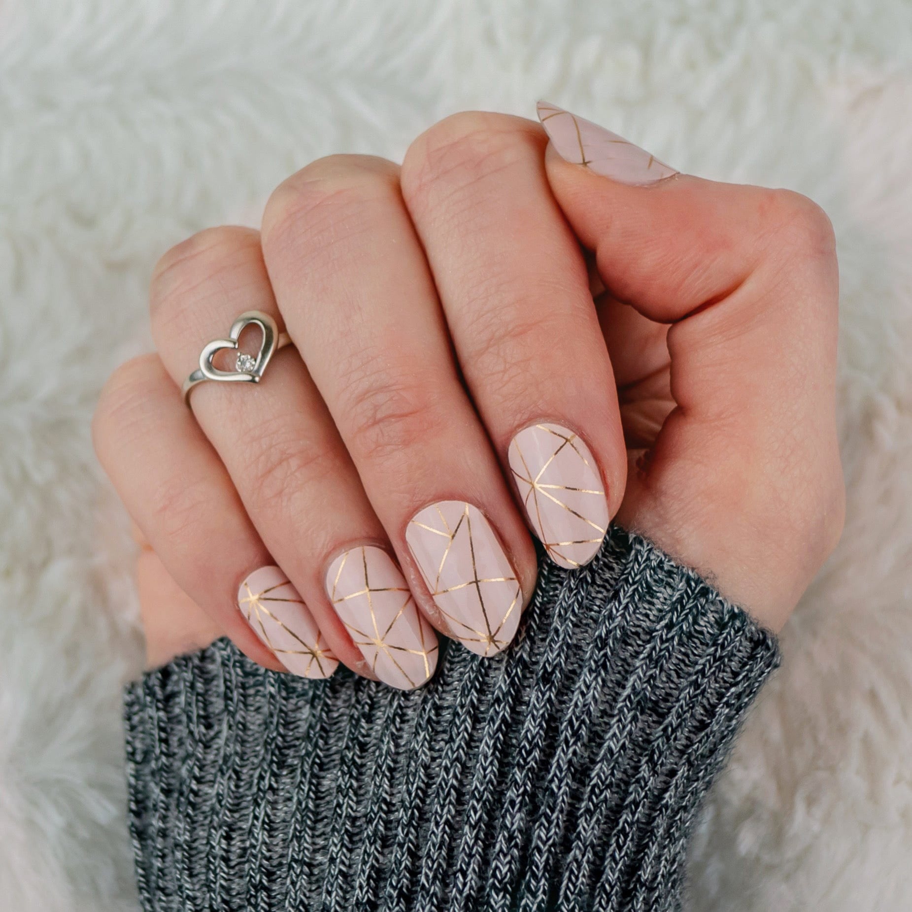 Ce design associe un nude rosé doux à de fines lignes dorées tracées comme un jeu géométrique. Les motifs apportent du rythme et de la structure, tout en restant légers et aériens.