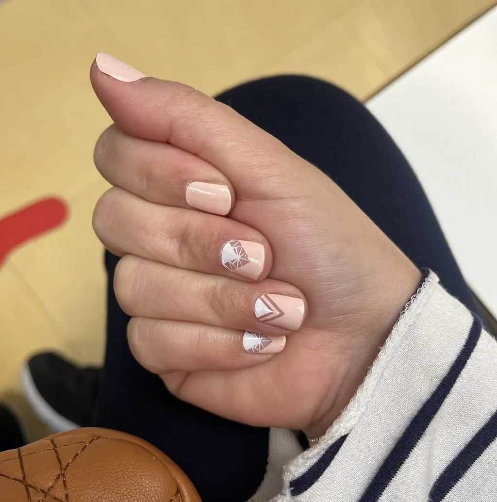 Cette manucure repose sur une base nude rosé douce, rehaussée de motifs géométriques fins et de lignes délicates. L’ensemble est équilibré, moderne et très raffiné, pour une manucure discrète avec un vrai sens du détail.